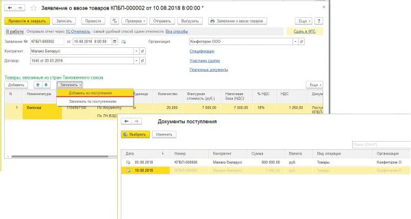 Если документ "Заявление о ввозе товаров" формируется на основании конкретного документа поступления, то в его табличную часть автоматически переносятся сведения только из этого документа поступления.