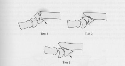 Перелом Смита. Классификация в модификации Thomas. Тип 1: внесуставные, поперечные; тип 2: внесуставные, косые с ладонным смещением запястья; тип 3: внутрисуставные с ладонным смещением запястья. Тип 3 - эквивалент ладонного переломовывиха Бартона.